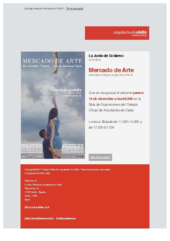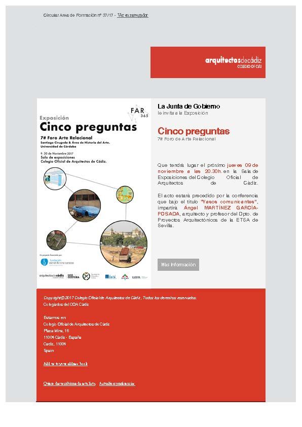 Exposición Cinco preguntas. 7# Foro de Arte Relacional Conferencia Ángel MARTÍNEZ GARCÍA-POSADA La Junta de Gobierno le invita a la Exposición Cinco preguntas 7# Foro de Arte Relacional Que tendrá lugar hoy jueves 09 de noviembre a las 20.30h. en la Sala de Exposiciones del Colegio Oficial de Arquitectos de Cádiz. El acto estará precedido por la conferencia que bajo el título «Vasos…