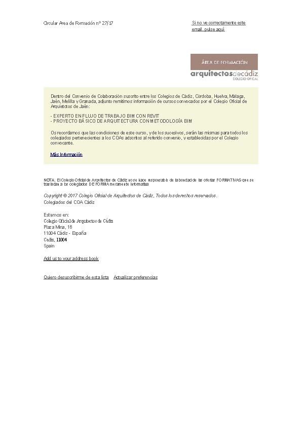 Difusión cursos COA Jaén Circular Área de Formación nº 27/17 Si no ve correctamente este email, pulse aquí Dentro del Convenio de Colaboración suscrito entre los Colegios de Cádiz, Córdoba, Huelva, Málaga, Jaén, Melilla y Granada, adjunto remitimos información de cursos convocados por el Colegio Oficial de Arquietctos de Jaén: – EXPERTO EN FLUJO DE…