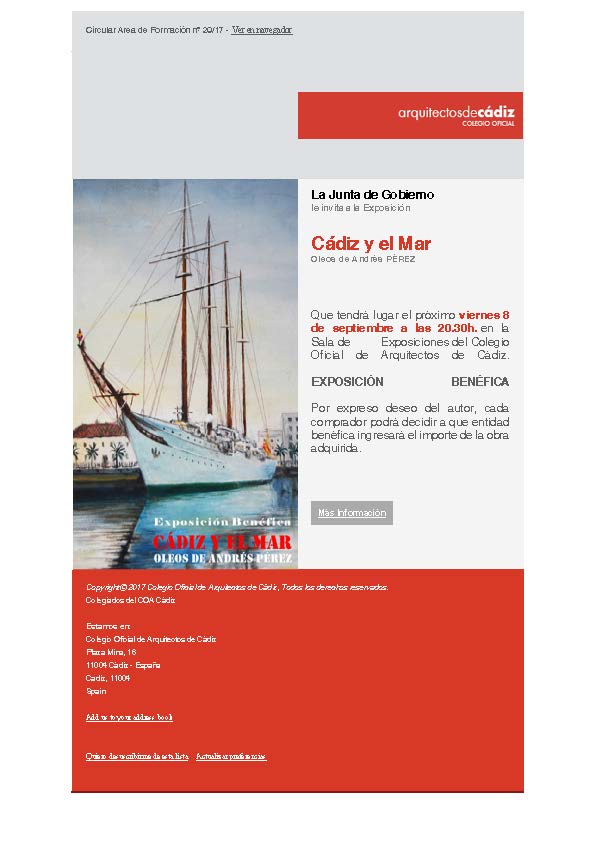 Expo Andrés Pérez Cádiz y el Mar Oleos de Andrés PÉREZ Que tendrá lugar el próximo viernes 8 de septiembre a las 20.30h. en la Sala de Exposiciones del Colegio Oficial de Arquitectos de Cádiz. EXPOSICIÓN BENÉFICA Por expreso deseo del autor, cada comprador podrá decidir a que entidad benéfica ingresará el importe de la obra adquirida. Más Información