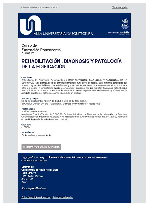 Aula Universitaria de Arquitectura Curso de Formación Permanente AUA05.17. REHABILITACIÓN , DIAGNOSIS Y PATOLOGÍA DE LA EDIFICACIÓN Curso de Formación Permanente AUA05.17 REHABILITACIÓN , DIAGNOSIS Y PATOLOGÍA DE LA EDIFICACIÓN Objetivos Éste Curso de Formación Permanente en REHABILITACIÓN, DIAGNOSIS Y PATOLOGÍA DE LA EDIFICACIÓN, se plantea como objetivo fundamental enunciar y diagnosticar las diferentes patologías…