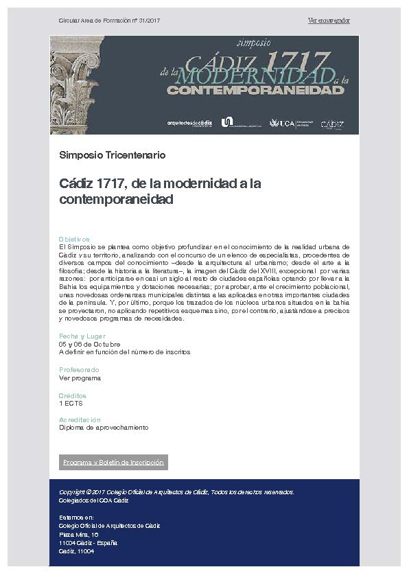 Simposio Tricentenario Cádiz 1717, de la modernidad a la contemporaneidad Simposio Tricentenario Cádiz 1717, de la modernidad a la contemporaneidad Objetivos El Simposio se plantea como objetivo profundizar en el conocimiento de la realidad urbana de Cádiz y su territorio, analizando con el concurso de un elenco de especialistas, procedentes de diversos campos del conocimiento…