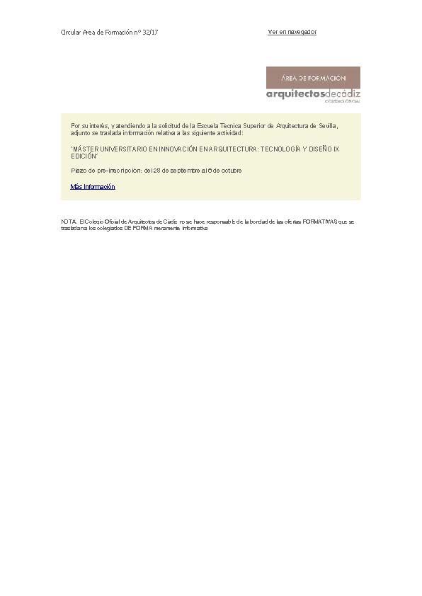 Difusión de cursos ETSA Sevilla Por su interés, y atendiendo a la solicitud de la Escuela Técnica Superior de Arquitectura de Sevilla, adjunto se traslada información relativa a las siguiente actividad: `MÁSTER UNIVERSITARIO EN INNOVACIÓN EN ARQUITECTURA: TECNOLOGÍA Y DISEÑO IX EDICIÓN´ Plazo de pre-inscripción: del 28 de septiembre al 6 de octubre Más Información