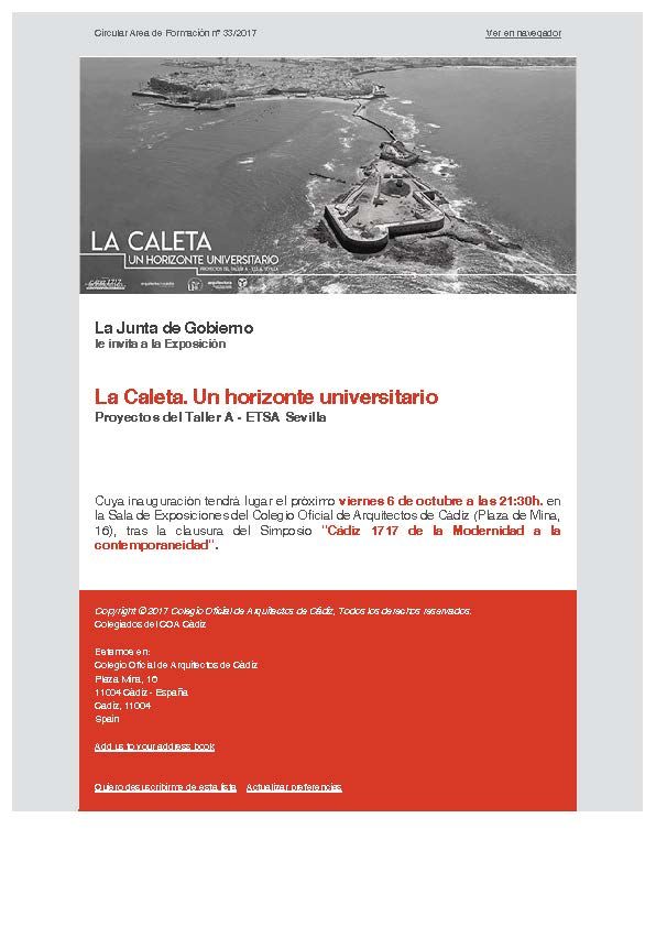 Exposición La Caleta. Un horizonte universitario Proyectos del Taller A – ETSA Sevilla La Junta de Gobierno le invita a la Exposición La Caleta. Un horizonte universitario Proyectos del Taller A – ETSA Sevilla Cuya inauguración tendrá lugar hoy viernes 6 de octubre a las 21:30h. en la Sala de Exposiciones del Colegio Oficial de Arquitectos de Cádiz (Plaza de…