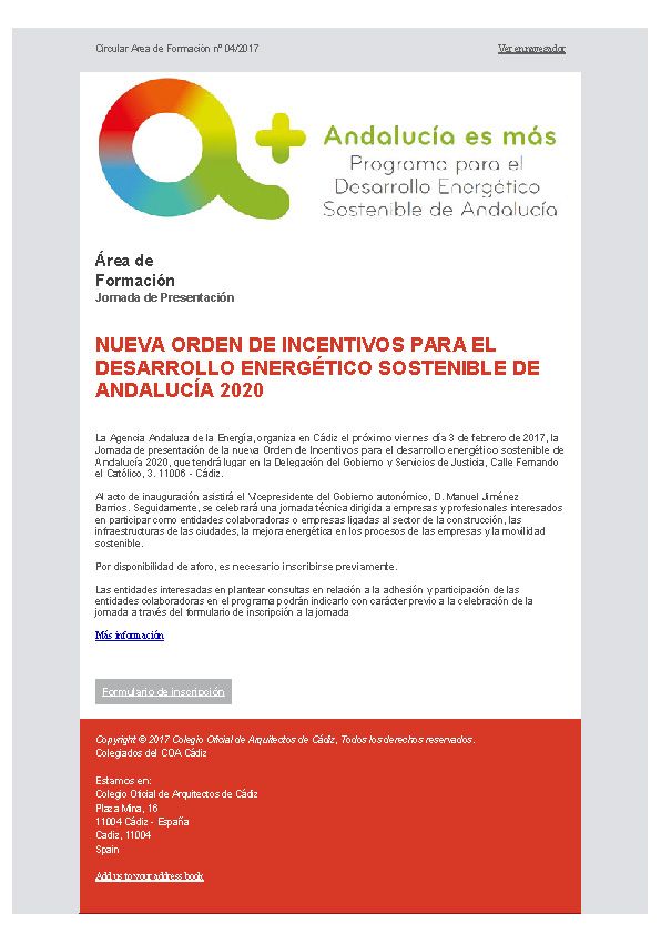 Jornada de Presentación NUEVA ORDEN DE INCENTIVOS PARA EL DESARROLLO ENERGÉTICO SOSTENIBLE DE ANDALUCÍA 2020 Área de Formación Jornada de Presentación NUEVA ORDEN DE INCENTIVOS PARA EL DESARROLLO ENERGÉTICO SOSTENIBLE DE ANDALUCÍA 2020 La Agencia Andaluza de la Energía, organiza en Cádiz el próximo viernes día 3 de febrero de 2017, la Jornada de presentación de la nueva Orden de…