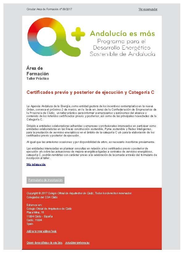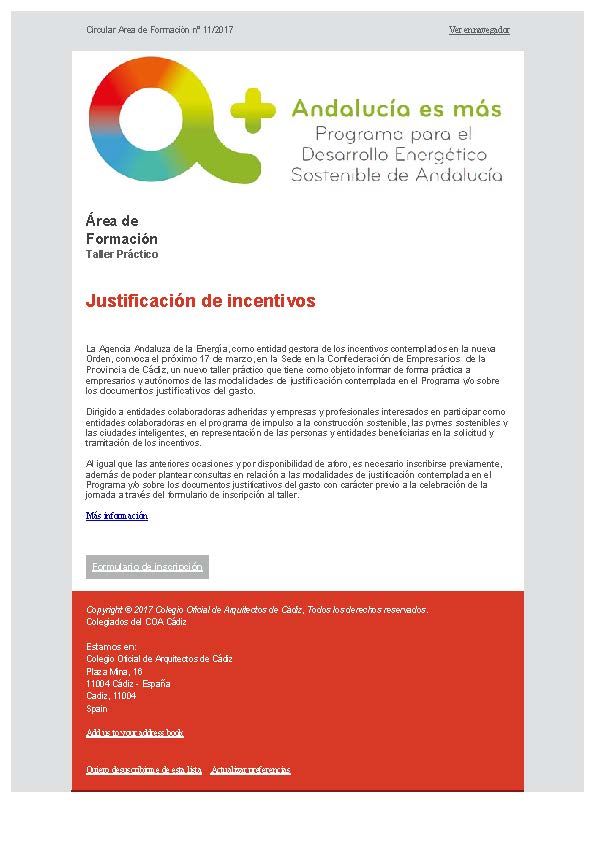 Taller Práctico Justificación de incentivos Área de Formación Taller Práctico Justificación de incentivos La Agencia Andaluza de la Energía, como entidad gestora de los incentivos contemplados en la nueva Orden, convoca el próximo 17 de marzo, en la Sede en la Confederación de Empresarios  de la Provincia de Cádiz, un nuevo taller práctico que tiene como objeto…