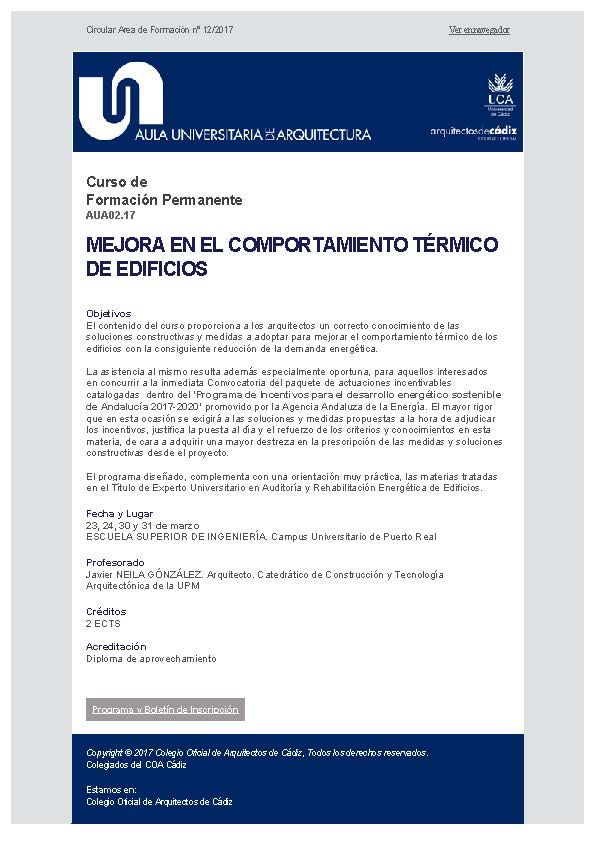 Aula Universitaria de Arquitectura Curso de Formación Permanente AUA02.17. MEJORA EN EL COMPORTAMIENTO TÉRMICO DE EDIFICIOS