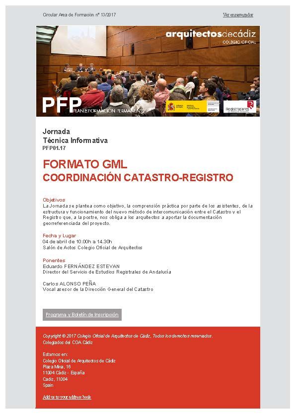 Jornada Técnica Informativa FORMATO GML: COORDINACIÓN CATASTRO-REGISTRO Jornada Técnica Informativa PFP01.17 FORMATO GML COORDINACIÓN CATASTRO-REGISTRO Objetivos La Jornada se plantea como objetivo, la comprensión práctica por parte de los asistentes, de la estructura y funcionamiento del nuevo método de intercomunicación entre el Catastro y el Registro que, a la postre, nos obliga a los arquitectos a aportar…