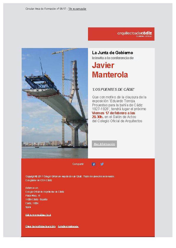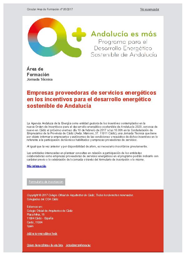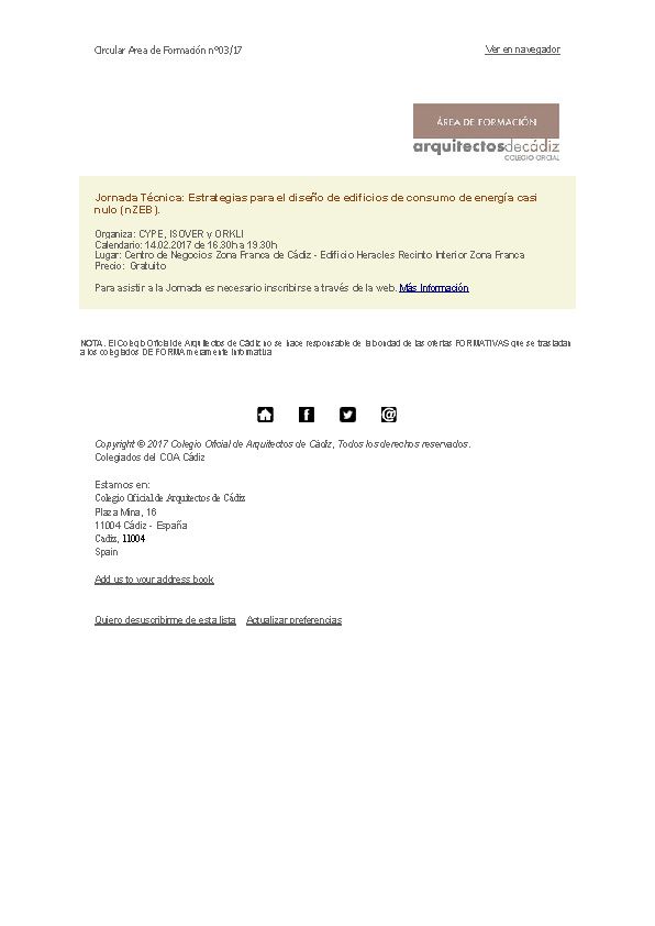 Difusión de Cursos y Jornadas Jornada Técnica: Estrategias para el diseño de edificios de consumo de energía casi nulo (nZEB).  Organiza: CYPE, ISOVER y ORKLI Calendario: 14.02.2017 de 16.30h a 19.30h Lugar: Centro de Negocios Zona Franca de Cádiz – Edificio Heracles Recinto Interior Zona Franca Precio:  Gratuito Para asistir a la Jornada es necesario inscribirse a través de la…