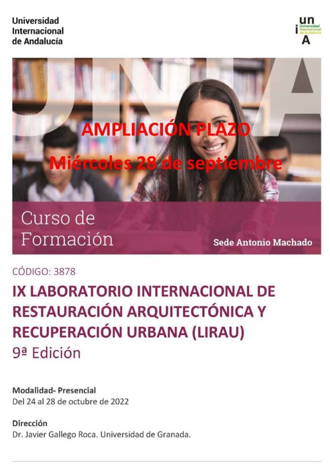 Becas LIRAU 2022 8 BECAS: LABORATORIO INTERNACIONAL DE RESTAURACION ARQUITECTONICA Y RECUPERACION URBANA AMPLIACIÓN DE PLAZO: 8 DE SEPTIEMBRE El Colegio convoca 8 Becas cuatro para colegiados pertenecientes a la Asociación de Jóvenes Arquitectos y cuatro para el resto de colegiados, para el taller “Laboratorio Internacional de Restauración Arquitectónica y Urbana (LIRAU), en la Sede Antonio Machado…