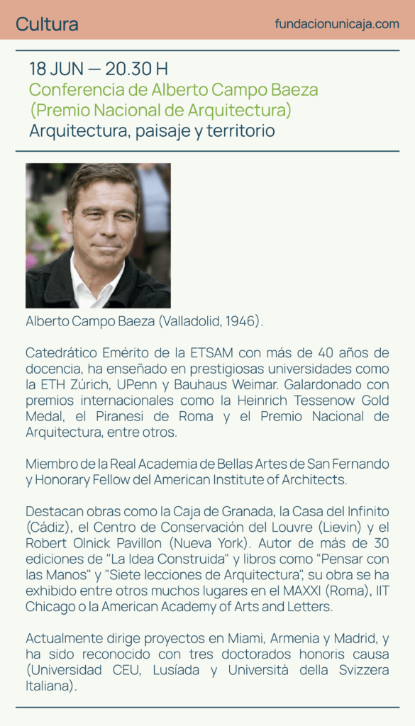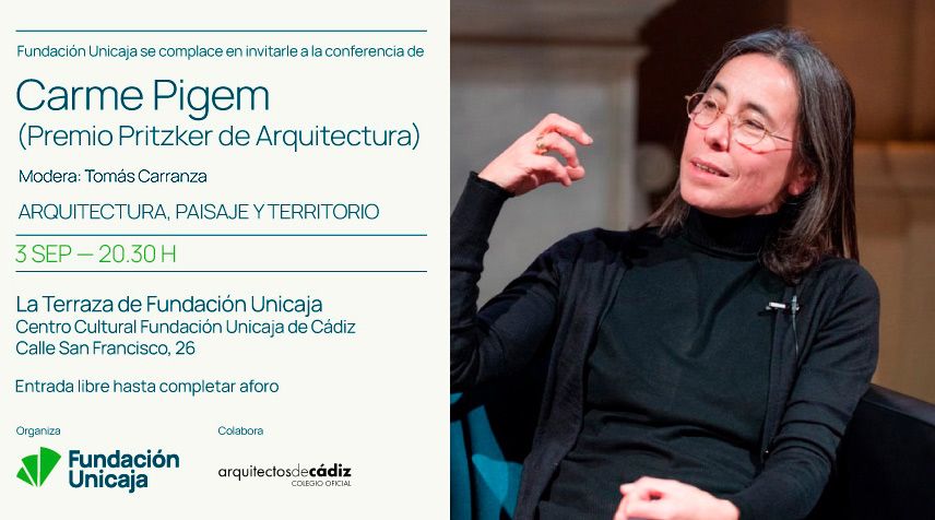 La Fundación Unicaja dentro de la programación de «La Terraza de Fundación Unicaja» organiza con la colaboración del Colegio de Arquitectos de Cádiz el ciclo «Arquitectura, paisaje y territorio», que analizará la evolución urbana de la ciudad a través de su arquitectura, su patrimonio y su diálogo con el entorno natural de la mano de las más destacadas figuras de la arquitectura contemporánea internacional en diferentes encuentros moderados por Tomás Carranza.