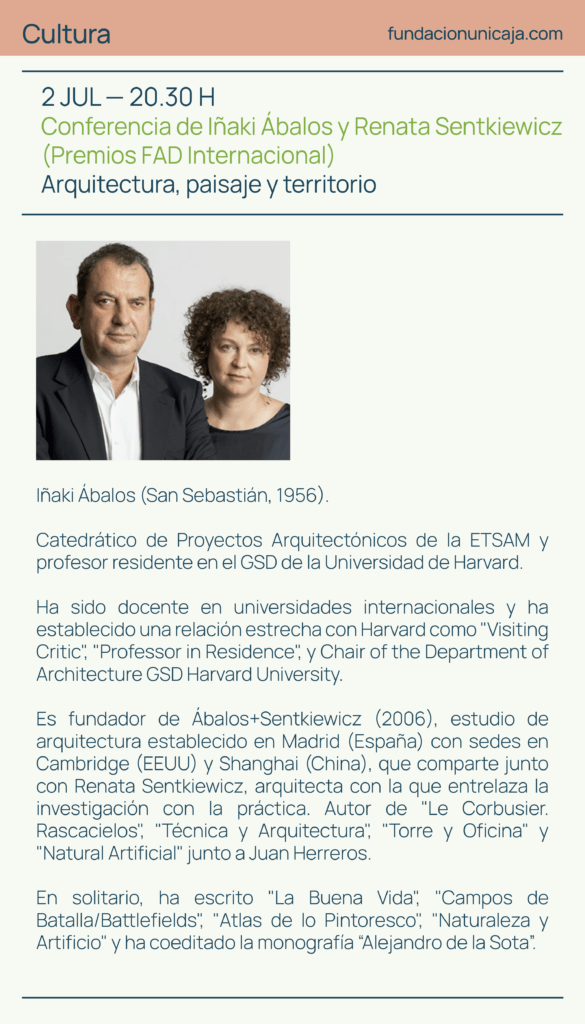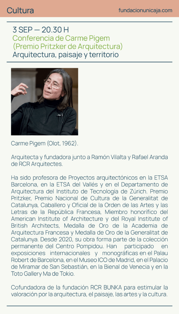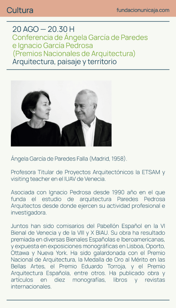 La primera sesión tendrá lugar el 18 de junio con Alberto Campo Baeza, Premio Nacional de Arquitectura, que hablará sobre la relación entre la arquitectura y la sociedad. El 2 de julio, el encuentro entre Iñaki Ábalos y Renata Sentkiewicz, premio FAD Internacional, estará dedicado a la ecología y la sostenibilidad. Ángela García de Paredes e Ignacio García Pedrosa, Premio Nacional de Arquitectura, protagonizarán la cita del 20 de agosto relacionada con la cultura y el patrimonio artístico. Por último, la Premio Pritzker de Arquitectura Carme Pigem protagonizará un encuentro sobre arquitectura y naturaleza, ya el 3 de septiembre.